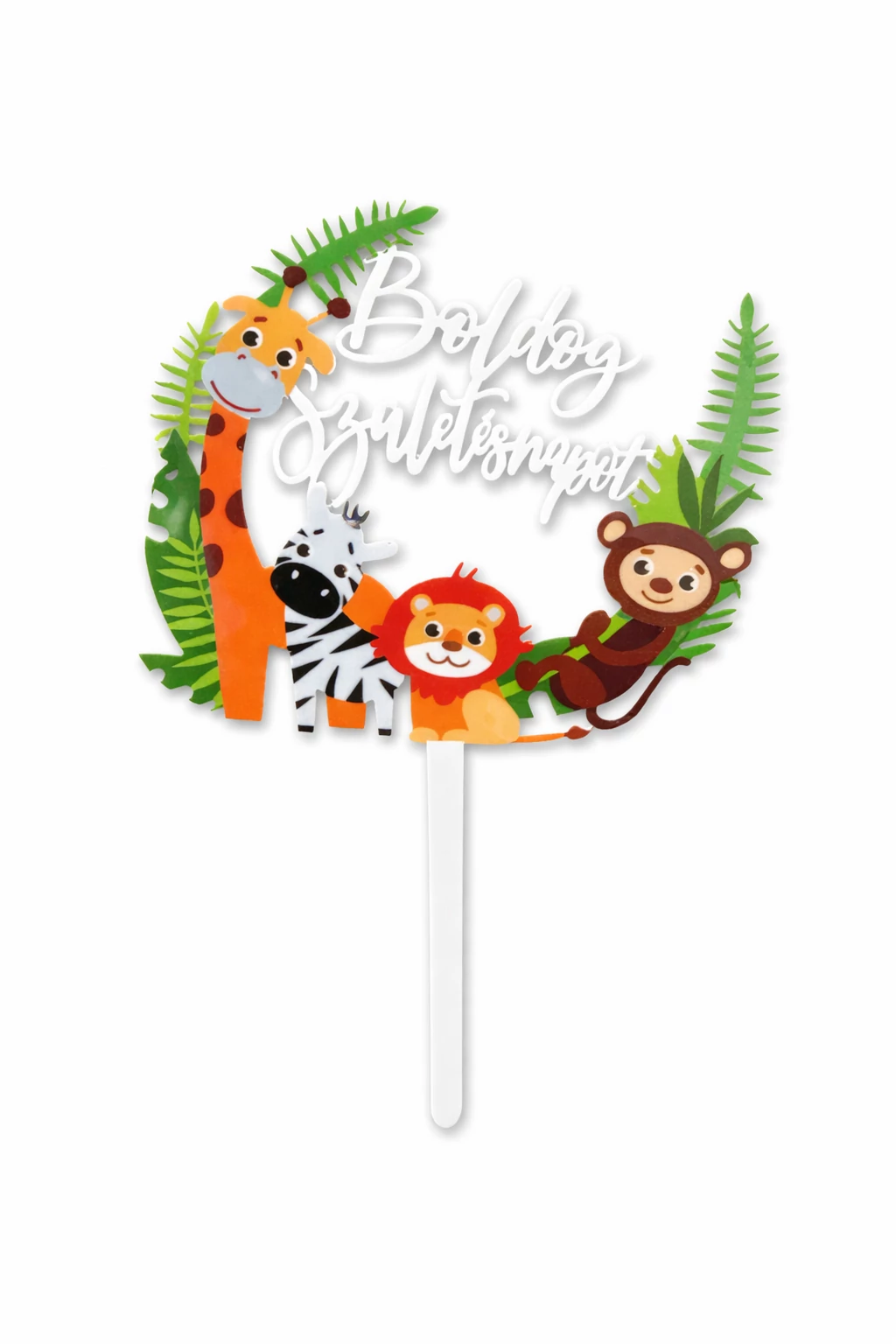 Vidám és színes tortadísz, amely tökéletes választás állatos vagy dzsungel témájú születésnapi tortákhoz. A bájos zsiráf, zebra, oroszlán és majom figurák körbeölelik a „Boldog Születésnapot” feliratot, így igazán látványos és szerethető dekorációvá teszik a tortát.