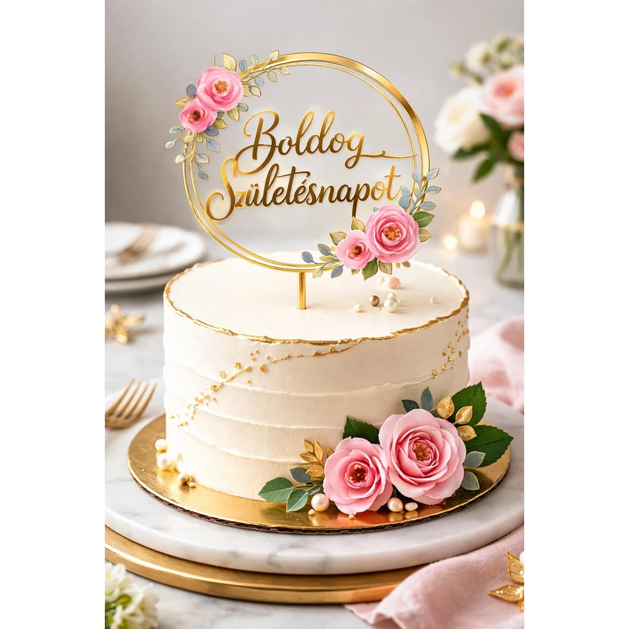 Elegáns, arany színű „Boldog Születésnapot” tortadísz romantikus virágmintás koszorúval. A fényes, tükrös arany feliratot pasztell rózsaszín virágok és finom, kékeszöld levelek díszítik, amelyek igazán különleges és ünnepi megjelenést kölcsönöznek a tortának.