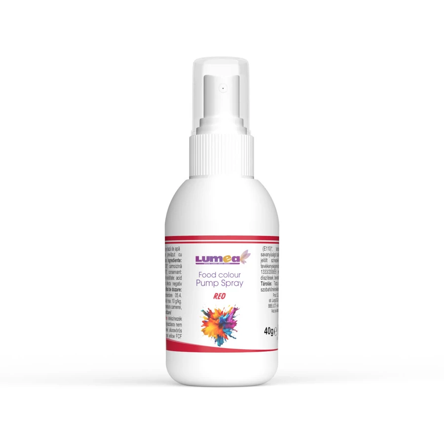 Lumea piros vízbázisú szórófejes ételfesték élénk, karakteres piros árnyalatot biztosít, amely figyelemfelkeltő és ünnepi megjelenést ad cukrászati dekorációidnak. A praktikus szórófejes kialakítás gyors és egyenletes felvitelt tesz lehetővé különböző felületeken.