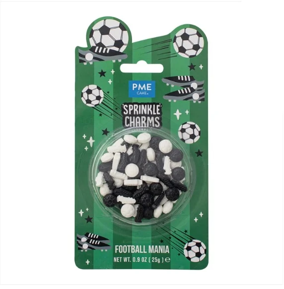 A PME Football Mania Mix tökéletes dekoráció minden focis tematikájú tortához és desszerthez. A keverék fekete-fehér színű focilabda és futballcipő formájú konfetti cukordíszeket tartalmaz, amelyek azonnal sportos hangulatot kölcsönöznek az alkotásaidnak.