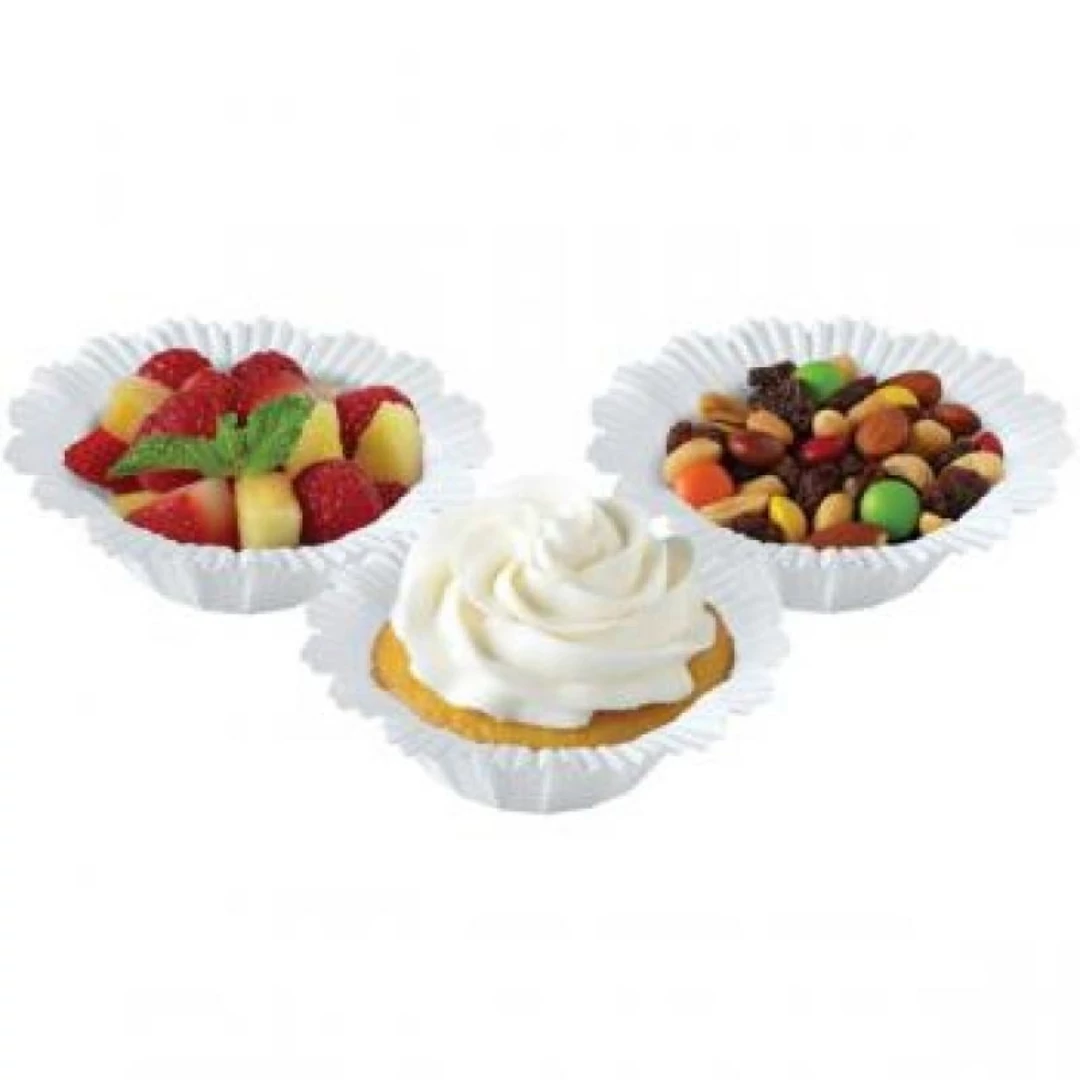 Virág formájú fehér muffin papírok, amelyek különleges és elegáns megjelenést adnak a desszerteknek. Ideális esküvőkre és ünnepi alkalmakra.
